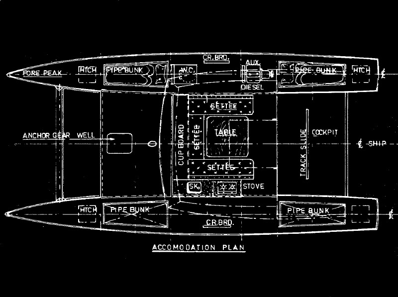 The SNOWBIRD, a 32ft cruising catamaran has accommodation for 6 people and is an ideal craft for family cruising. This craft has sufficient buoyancy for a small auxilary motor either diesel or petrol. An 18 h.p. Wankel gives a cruising speed of 7 knots and a maximum speed of 9 knots. Although designed as a family cruiser the Snowbird has proved a winner in many N.Z. multihull races. With a sail area of 482 sq.ft speeds of up to 15 knots reaching are easily obtained and 7 or 8 knots on the wind are quite common. The Snowbird has full standing headroom in the hatches and 4'6" headroom on the bridge deck. However, a large sliding hatch can be fitted in the cabin top to increase headroom if required. The toilet and galley are situated in the hulls which gives full headroom in these areas. The Snowbird is constructed from sheet plywood and the latest techniques of hull construction are used with various areas being reinforced with fibreglass chopped strand mat and fibreglassing resin to ensure a strong watertight hull which is easily constructed by the amateur. This craft also lends itself to foam sandwich and end grain balsa construction.