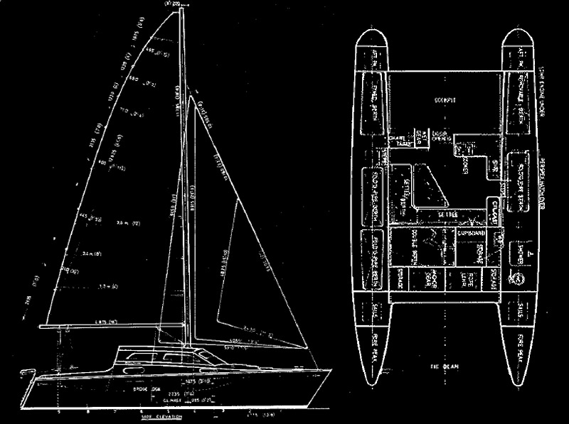 The TRADE WINDS is a symmetric vee hull form, without centreboards. This is a larger version of the 10.36m Landfall and is designed for ocean cruising and in consequence is robust in construction. The craft is constructed over conventional frames with fore and aft stringers with watertight bulkheads fore and aft to ensure positive buoyancy. The hull is skinned in 2 layers of 6mm 5ply which ensures an extremely strong construction. The heavy laminated keels have been designed to take the rigours of grounding. The interior layout is a 9 berth and features a large spacious bridge deck area for cruising in comfort. This particular craft has a double berth cabin ahead of the saloon area with its own wash basin, shower and WC. The Trade Winds has a bridge deck clearance of 685mm and this increases when sailing to nearly 850mm because of the wave formation around the hulls. The three quarter rig has been designed to be easily handled by a small crew which with slab reefing allows the mainsail to be reduced so that the craft can be sailed in extremely heavy conditions. The Trade Winds has been designed for ocean cruising.