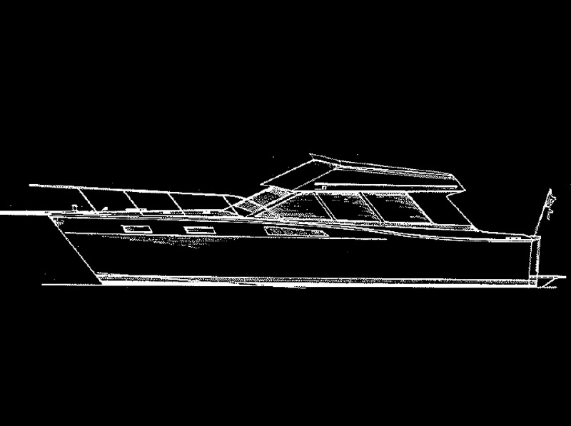 There are various cabin layouts shown on the plan and these are shown on the study print. All versions have a flying bridge as this vessel has been specifically designed to take the weight of a bridge well above the waterline. The construction is of double diagonal planking or sheet plywood with 2 skins of 1/2" (12mm) on the bottom and 2 skins of 3/4" (9mm) on the sides. These are over frames at approximately 3ft (914mm) centres with laminated fore and aft stringers, chines, laminated gunwales etc. for maximum strength with minimum weight. The keelson and deadwood, stem etc. are strongly constructed to give an extremely rigid backbone down the centre of the vessel. A 275 h.p. Volvo with 2 to 1 reduction gives a top speed of 21.5 knots in the 40ft version. Twin 165 h.p. Volvo diesels give a top speed of 23 knots. A 8V71 turbo-charged GM a top speed of 27 knots in the 40 footer. Performance figures given on request.
