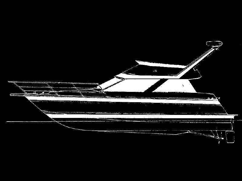 The plan includes two interior layouts, one of which is shown on the study print. However, the layout can be altered to suit individual requirements. The achieve a top speed of 25 knots and a cruise of 22 knots a V8 turbo Caterpillar on 11/2 to 1 reduction should be used or an engine of similar weight and h.p. The hull shape also suits I/O propulsion and twin 6 cylinder diesel outdrives with an all up weight of 2000 lbs would give speeds of 30 knots and cruise at 25 knots. The cabin structure and flying bridge have been designed to minimise wind resistance both in profile and in head wind conditions. The styling has been designed to fulfil the need for an up-to-date modern appearance which should not date.