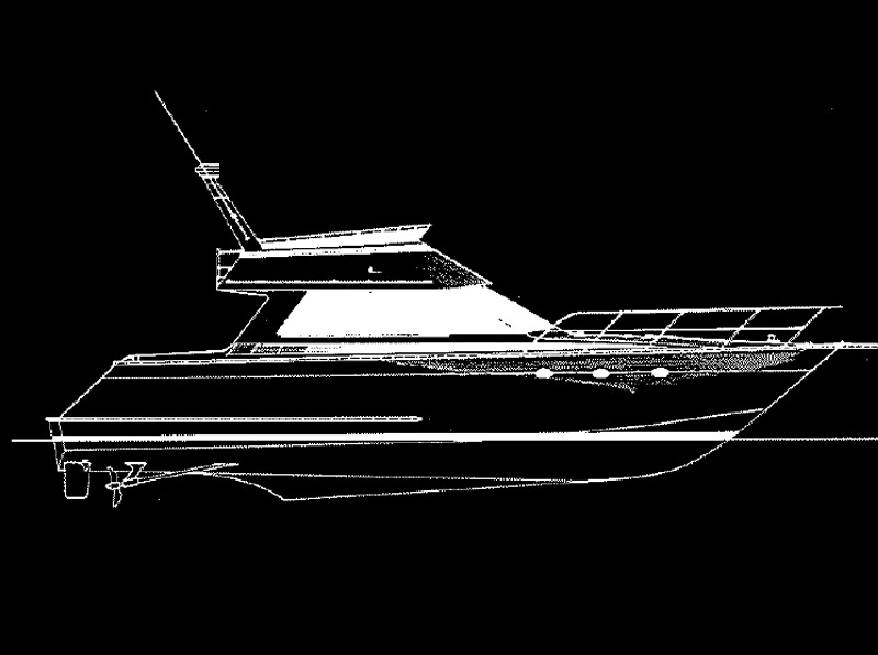 The internal layout can be varied to suit individual requirements. The layout shown on the study print however is one which we have evolved over many years of experience in vessels of this type and size and has proven to be ideal for both cruising and for game fishing etc. On this design we have used a built in boarding platform. This is incorporating a raked after transom to deflect the water under the craft when in reverse. The boarding platform has been kept high enough to keep it reasonably dry when backing into a sea and it can also incorporate live bait tanks and storage outside the cockpit area. The flying bridge is of generous proportions and it has been designed to minimise windage both from ahead and abeam.