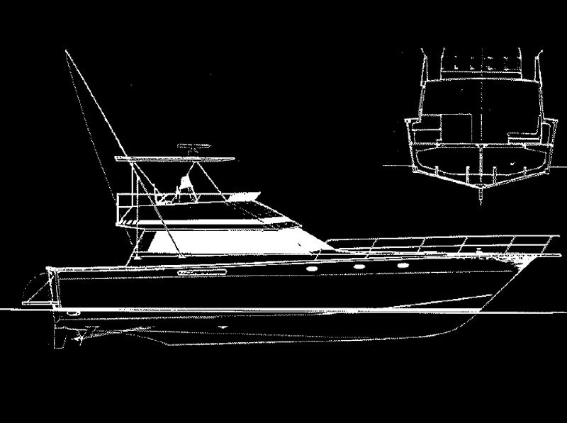 The interior layout is fairly conventional and is shown on the study print. The flying bridge was specifically laid out with game fishing in mind and the boarding platform has been designed so it can be folded up against the transom. This keeps it clear of the water in rough conditions and out of the way for fishing. However, it can be instantly lowered if desired. The Envoy is capable of extensive cruising in open sea conditions with generous freeboard forward, deep forefoot and relatively large keel ensuring that the craft has good directional stability especially at the low speeds where the vessel is normally used for fishing.