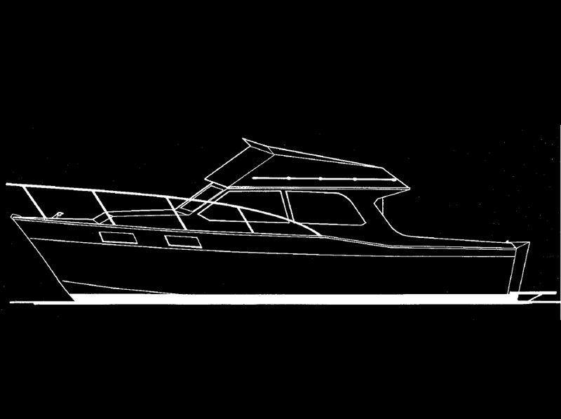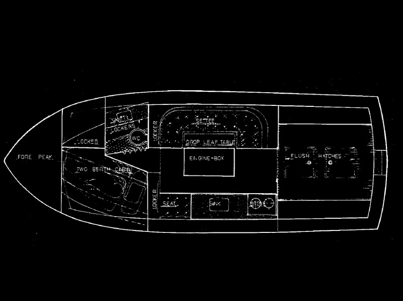 This craft is hard chine and is designed to give reasonable planing speeds with diesel power. The hull features a built in spray deflector on the chine, and flare bow with a knuckle in the sides for both appearance and to increase the effectiveness of the flare. The beamy hull has been designed to support the weight of the steel construction and medium diesel engines up to 200 h.p. A 150 h.p. Ford on 2 to 1 reduction would give a top speed of 17 knots and a cruising speed of 15/16 knots. The hull is constructed over frames and fore and aft stringers 11/4 x 1/4"; and 3 x 1/4" for the frames. The hull is plated completely in V," steel plate and the flare is formed from diagonal strips 6 to 9" in width. This eliminates the need of difficult plate shaping and makes the craft relatively simply to construct. The craft features our gullwing after section for maximum lift in the stern area. The hull is constructed upside down on a simple building jig which makes welding of the plate comparatively simple. The interior consists of two bunks forward with toilet and wardrobe immediately behind. The saloon has galley, dinette and settee and the engine box is used as a table. The craft features a large cockpit for fishing but the cabin can be extended further aft if desired.