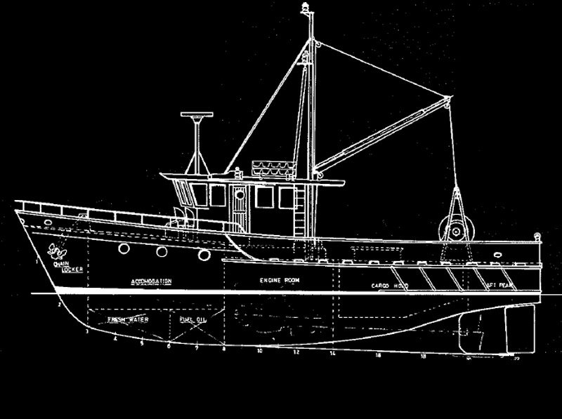 The 58ft. FRONTIER is a hard chine displacement hull capable of speeds up to 12 knots. A 400 s.h.p. diesel will give 12 knots at full throttle and cruise at 10.8 knots. The craft has a wide fairly flat stern section which enables it to leave the wake clean at maximum speed thus increasing the speed considerably from normal displacement hulls with a consequent fuel saving. The Frontier has a hold capacity of 1440 cubic feet. The standard propeller aperture is for a 54" propeller. The hull is plated in 5mm to 6mm steel over fore and aft stringers. The frames are at 3ft centres with the engine room frames at 2'0" spacings and the hole spacings at 2'6". This allows the craft to be easily extended out to 65ft if desired. The shell plating is supported on the fore and aft stringers and the craft is constructed upside down for ease of welding and plating. There is approximately 30 tonnes of steel required to build the hull, decks and cabin. The Frontier has a four berth crew accommodation under the fore deck. However, this could easily be increased to 8 berth if desired. In the fore cabin there is also a toilet, wash basin and ample hanging lockers. The wheelhouse has a dinette, galley and oil skin locker and is roomy and spacious for crew comfort. The engine room is under the wheelhouse floor for ease of access and to prevent possible water entry. The Frontier has a working area of 26 x 16ft aft of the wheelhouse. This craft has been specifically designed for trawling and purse seining and has been designed to give above average speed to and from the fishing grounds. The hull takes approximately 2500 hours to construct and the decks, cabin, engine beds etc. a further 3000 hours.