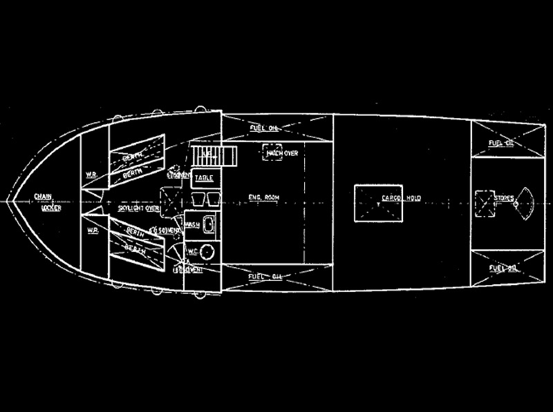 The plan includes lines drawing with table of offsets, plus detailed drawings of hull construction, general layout, cabin structure, decks, hatches etc. plumbing arrangement, shaft, steering, rudder etc. The plan has been drawn to comply with Marine Department survey requirements.