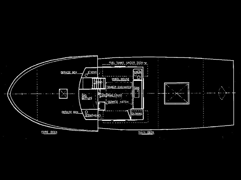 The 45ft. SEEKER is a hard chine displacement hull capable of speeds up to 12 knots. A 250 s.h.p. diesel should give 12 knots at full throttle and cruise at 10.8 knots. The craft has a wide fairly flat stern section which enables it to leave the wake clean at maximum speed thus increasing the speed considerably from normal displacement hulls with a consequent fuel saving. The Seeker has a hold capacity of 10 tonnes or 324 cubic feet. The craft has 7 tonnes loading capacity to the designed L.W.L. and it displaces 2000 lbs per inch of immersion and can safely be put down another foot which would give a further 24,000 lbs load carrying ability or 10 tonnes, The standard propeller aperture is for a 36" diameter propeller. However, this can easily be increased to 40" if desired. The hull is plated in thicknesses ranging from 5mm to 4mm and is constructed over frames at approximately 3 ft. centres. The frames in the engine room and other areas are slightly closer spaced to allow the vessel to be extended out to almost 50ft. if desired. The shell plating is supported on fore and aft stringers and the craft is constructed upside down for ease of welding and plating. There is approximately 12 tonnes of steel required to build the hull, decks and cabin.