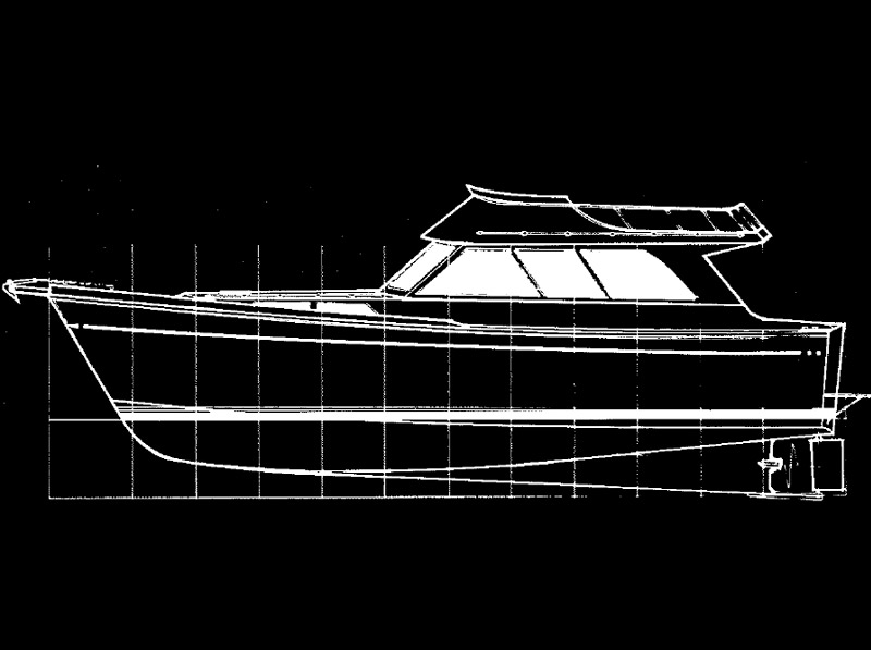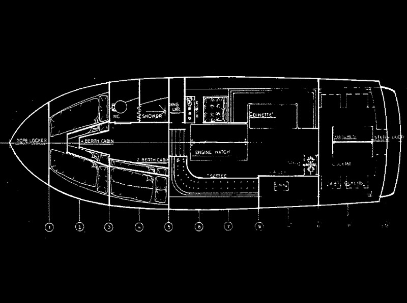 The interior layout consists of a 4 berth fore cabin with a WC and shower immediately after this to starboard. There is a 2 berth cabin to port of the shower and WC, this comprises the forward internal accommodation. The saloon is large and airy and is 15'3" fore and aft and 10'6" wide. The flying bridge is optional and is constructed from 9mm plywood to keep the weight down to a minimum. The cockpit is self draining and the cockpit floor is 1'9" above the L.W.L., so positive drainage is easily obtained. Large storage hatches are provided through the cockpit floor. The cockpit is 6'11" x 10'6". The hull is constructed upside down and pivoting points and lifting arrangement are shown on the plan.