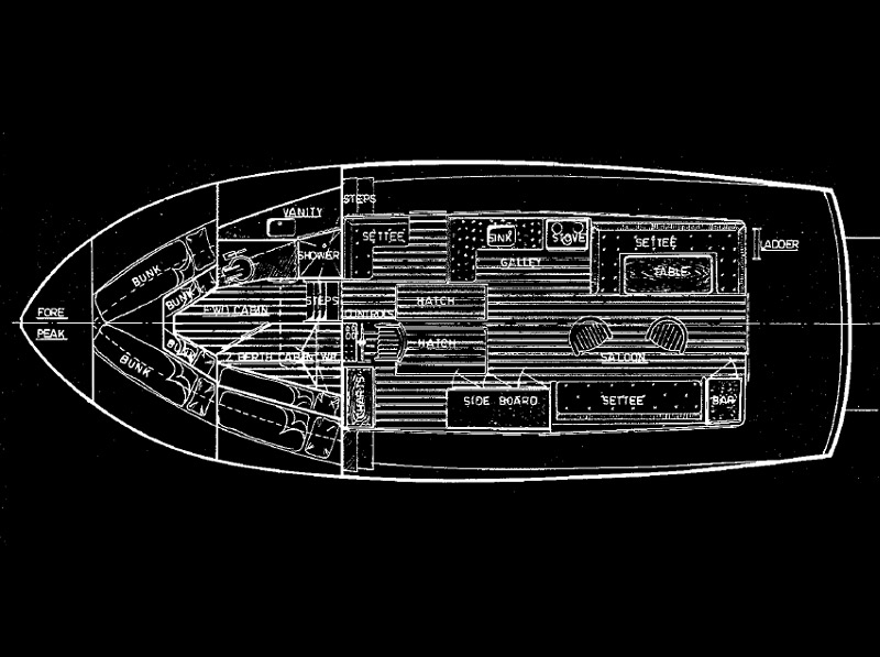 The plan includes lines drawing with table of offsets, hull construction plus detailed drawings of interior layout, etc.