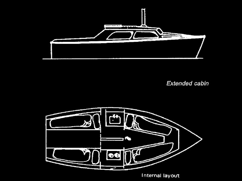Three cabin versions are shown on the plan. The first one features maximum cockpit size 8'0" from transom to bulkhead; the second with the same cockpit size and raised dodger and the third with a 6'0" cockpit and extended cabin and dodger. Internal layout consists of two bunks forward and two quarter berths (4 berth), with galley and sink in the extended cabin version.