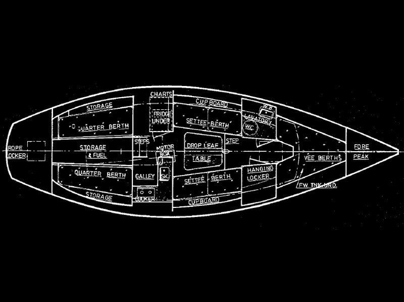 There is a large amount of room below decks for a craft of this length with full headroom throughout the floor area, extremely large quarter berths and plenty of storage. The engine has been offset to give maximum protection to the propeller. This makes engine installation extremely simple and a motor of 20 h.p. such as the normal twin cylinder diesel used in these craft gives a top speed of 8 knots. The craft is constructed from 3mm plate over a framework which is mainly 75 x 5 bar with an internal flat web of 50 x 6. The frames are nearly all at 3ft (914mm) centres and are overlaid with angle stringers of 32 x 32 x 4 (11/4 x 3/16). The hull is constructed upside down on a simple building jig and pivoting points are shown on the plan with lifting gear which allows the craft to be lifted between two cranes or chain blocks and allows the craft to be easily turned over for both sandblasting, welding etc. when completed. The Redhead features a long keel for maximum directional stability and the rudder is hung on the aft end of the keel for strength and simplicity of construction. The Redhead can be cutter rigged if desired and an inner forestay position is shown on the study print for those who require this set up.
